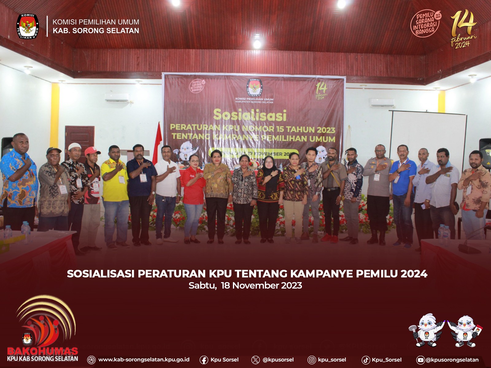 #Temanpemilih, pada jumat (17/11/2023) bertempat Aula Gedung Marthen Luther Wermit, KPU Kab. Sorong Selatan menggelar kegiatan sosialisasi tentang kampanye pemilu 2024. Sambutan sekaligus membuka kegiatan sosialisasi tersebut dilakukan oleh Ketua KPU kab. Sorong Selatan, Yonece Kambu.
