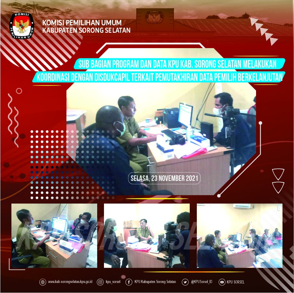 Teman Pemilih, Teminabuan 23 November 2021. Dalam rangka pemanfaatan data guna Pemutakhiran Data Pemilih Berkelanjutan Periode Bulan November Tahun 2021, melalui Sub Bagian Program Data, KPU Kabupaten Sorong Selatan melakukan Koordinasi dengan Disdukcapil Kabupaten Sorong Selatan terkait Data Pemilih Pemula, Data Kematian, Data Penduduk Pindah Masuk dan Data Penduduk Pindah Keluar