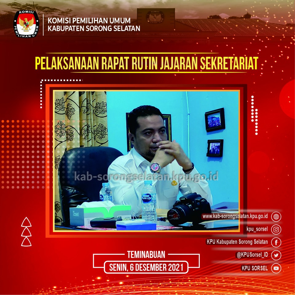 #TemanPemilih, Teminabuan - 6 Desember 2021, Dalam kegiatan rutin yang dilaksanakan setiap hari Senin, pada kesempatan ini Sekretaris KPU Kabupaten Sorong Selatan melakukan Rapat Evaluasi kepada seluruh Jajaran Kasubag dan Staf. Mohammad Rusdianto, SH (Sekretaris) menegaskan bahwa Pentingnya Konsolidasi dan Solidaritas antara Sekretariat dan Komisioner, Kasubag dan Staf sehingga dapat mengoptimalisasikan tercapainya efisiensi dan produktifitas ASN dalam melaksanakan tugas di lingkungan Sekretariat KPU Kab. Sorong Selatan.