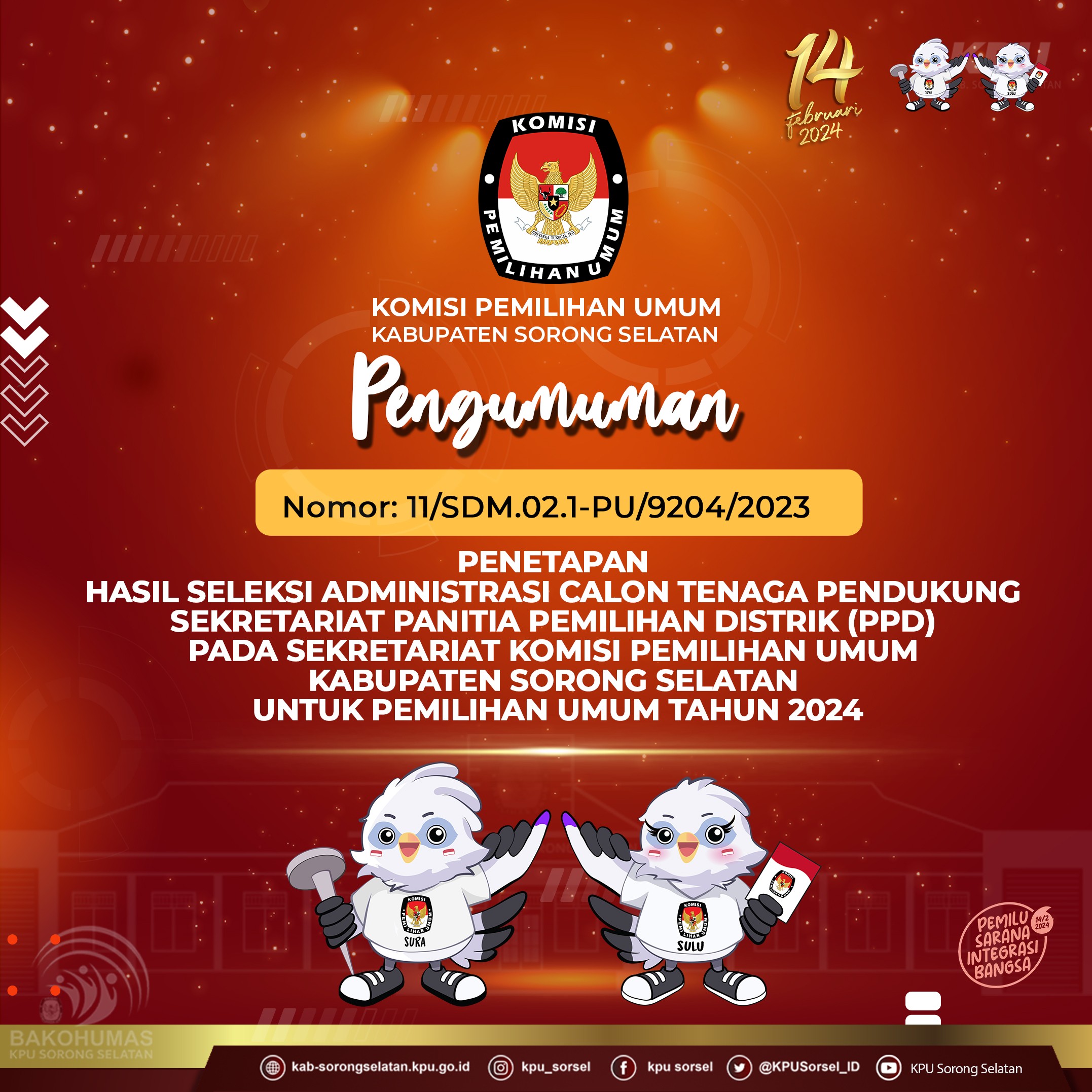 Berdasarkan hasil seleksi berkas pendaftaran yang masuk dalam rangka Seleksi Tenaga Pendukung Sekretariat Panitia Pemilihan Distrik (PPD) pada Sekretariat Komisi Pemilihan Umum Kabupaten Sorong Selatan untuk Pemilihan Umum Tahun 2024, dengan ini disampaikan hal-hal sebagai berikut :