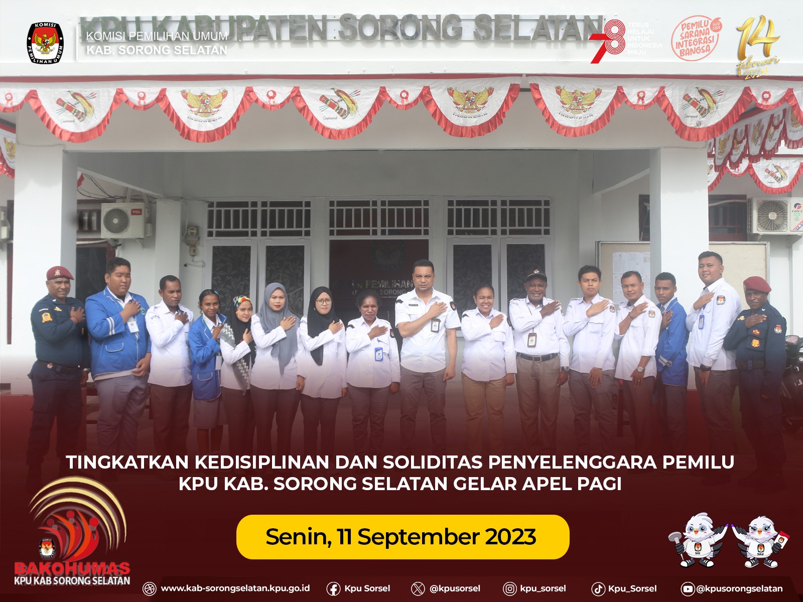 #TemanPemilih, KPU Kab. Sorong Selatan menggelar Apel Pagi pada hari senin (11/09/2023). Apel yang dilaksanakan di halaman kantor, dipimpin oleh Sekretaris KPU Kab. Sorong Selatan,Moh. Rusdi. Dalam arahannya, beliau mengingatkan kembali kepada peserta apel untuk dapat meningkatkan kedisiplinan dan soliditas di tengah tahapan pemilu 2024 yang kian padat ini.